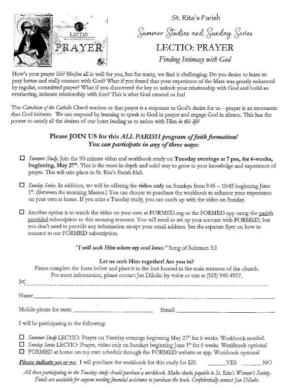 Confessions: Thursdays after 8am Mass & Saturdays, 3:30pm-4:30pm